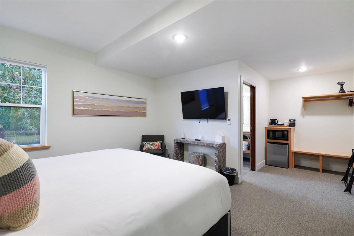 There's a large screen smart tv and a soft chair in the corner of the bedroom beside a narrow dining table (or use it as a desk). *This room is located above THEORY Coffee's amazing bakery which starts baking daily at 5:15 am and some guests may hear a baking mixer (while other guests don't hear anything). We have provided ear plugs and a sound machine on the nightstand for light sleepers*