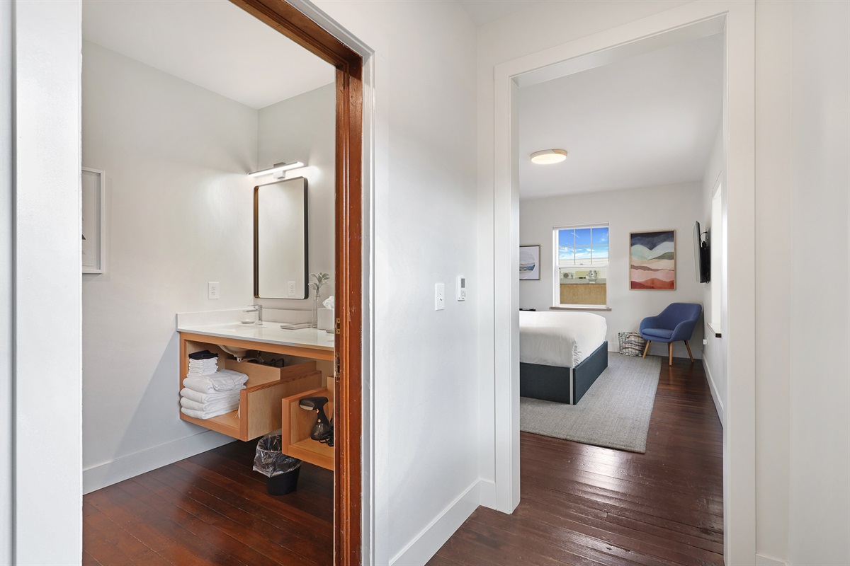 Guests will access a small entry lobby, one flight of stairs and a common hallway. The entire room 205 with bathroom will be private and accessible to only the guest (no sharing of space required). Please note there is no elevator in the building so climbing one flight of stairs is required for this space. If you need a space with few or no stairs, there are 2 ground floor rooms in the hotel, Room 101 and Room 102.