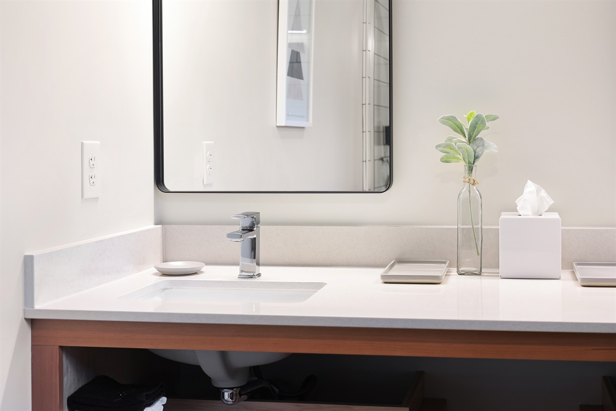 This charming king room really has it all - big views of Mt Shasta to watch the sunrise or alpenglow from bed as it covers the mountain with color, mountain modern furnishings, 100% brand new bathroom with custom tiled shower and glass shower door, completely new high end mattresses and bright white linens. Includes 55" 4K HD TV, fast and reliable fiber optic WiFi, stunning reclaimed wood floors and a restored solid wood door from Mt Shasta's historic Solari Hotel built in 1923. If you love clean air you'll appreciate the new HEPASilent air purifier in the room.